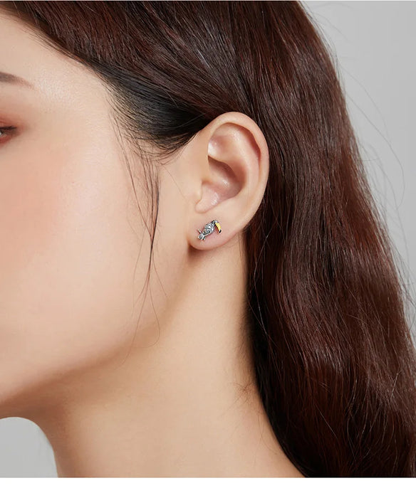 925 Sterling Silver Tropical Bird And Leaf Stud Earrings