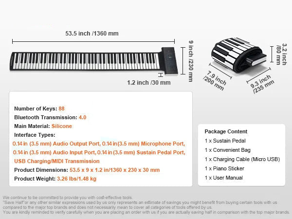 Streamlined and Portable Design: This 88-key roll-up keyboard piano can be compactly folded to a tablet-sized form, emerging as the quintessential musical ally whether you're engaged in home practice or spontaneous musical get-togethers on the move. With a built-in rechargeable battery, it empowers you to practice without temporal or spatial constraints. Ideal for educational institutions and collaborative learning, it is engineered to offer utmost convenience and amusement.