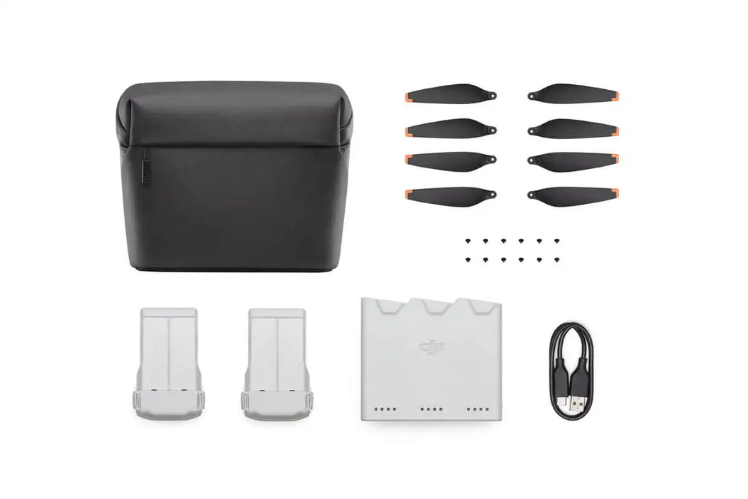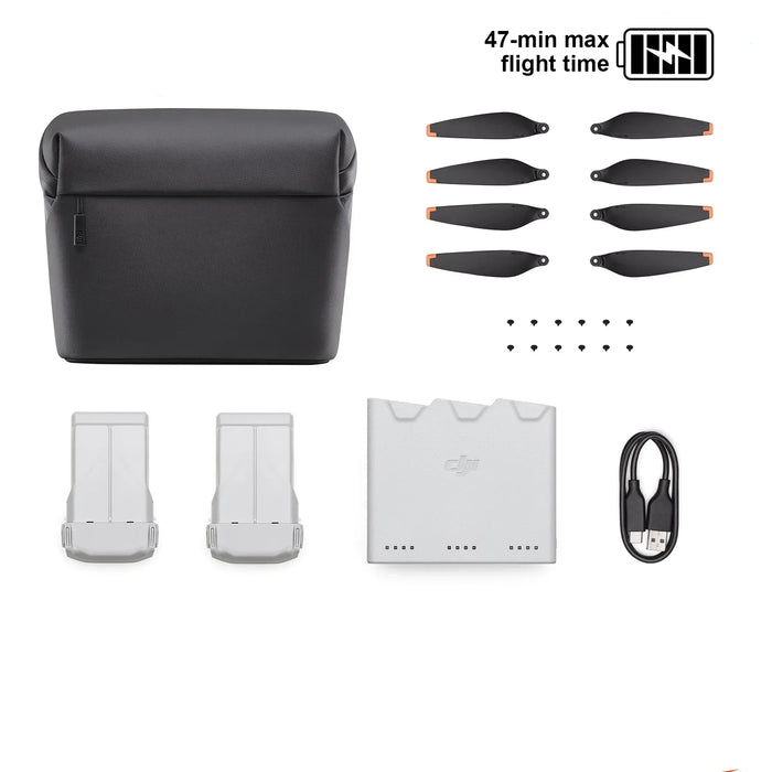 DJI Mini 3 Pro Fly More Kit Plus includes two Intelligent Flight Batteries Plus, a two-Way Charging Hub, data cable, shoulder bag, spare propellers, and screws, providing comprehensive support for your aerial photography experience, at a better price than buying separately.