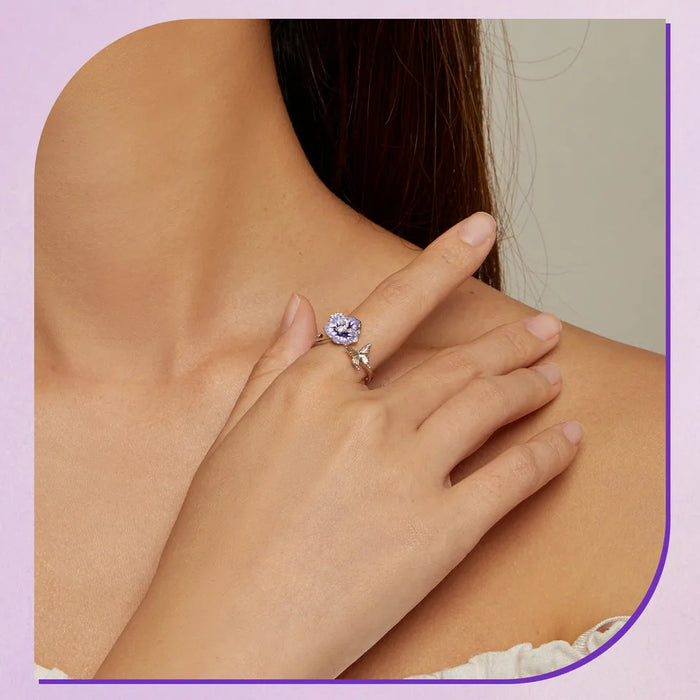 925 Sterling Silver Butterfly And Purple Pansy Flower Open Rings